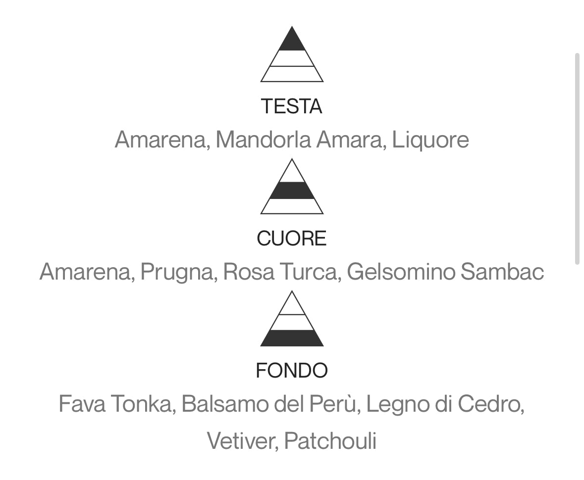 È ’impeto di un incontro sincero con la seduzione, sublimato da un bacio delizioso in cui perdersi e abbandonarsi. La composizione, decisa e maliziosa, travolge con le sue note di testa intense all’Amarena, Mandorla amara e Liquore.
