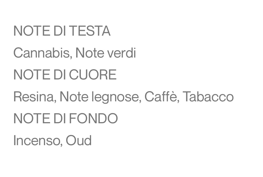 Le note scure di Caffè, Oud, Tabacco e Cannabis, suscitano una sensazione di appagamento sensoriale.