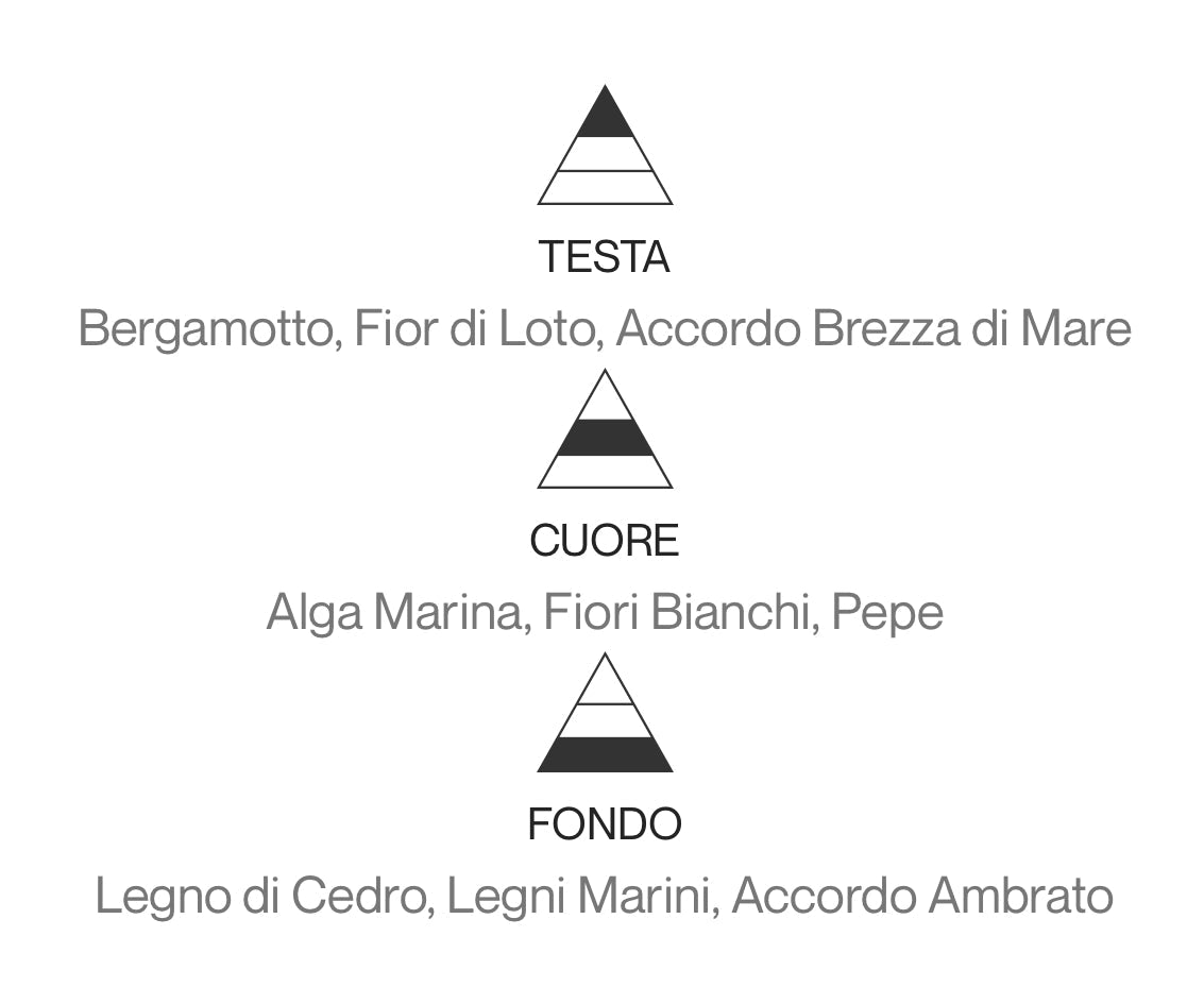 Note di testa al bergamotto, fior di loto e accordo brezza di mare. Cuore di alga marina, fiori bianchi e pepe.