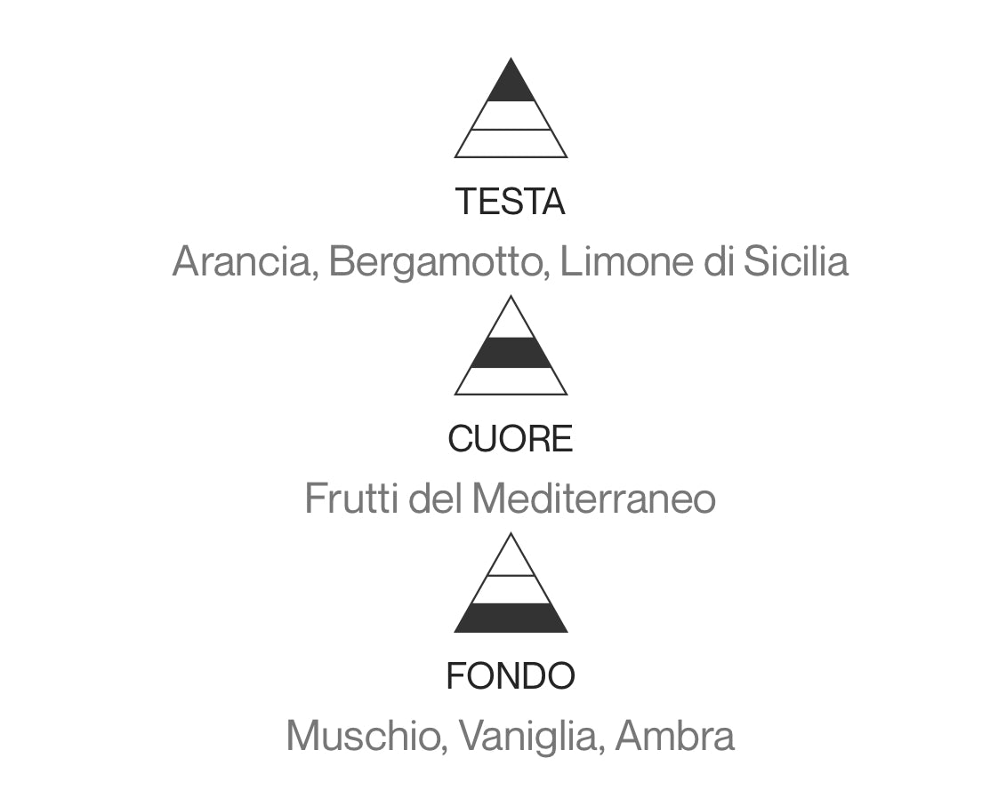 Le note di fondo alla Vaniglia, Muschio e Ambra donano un equilibrio caldo e dolce a questa fragranza vivace e luminosa, proprio come un giardino mediterraneo