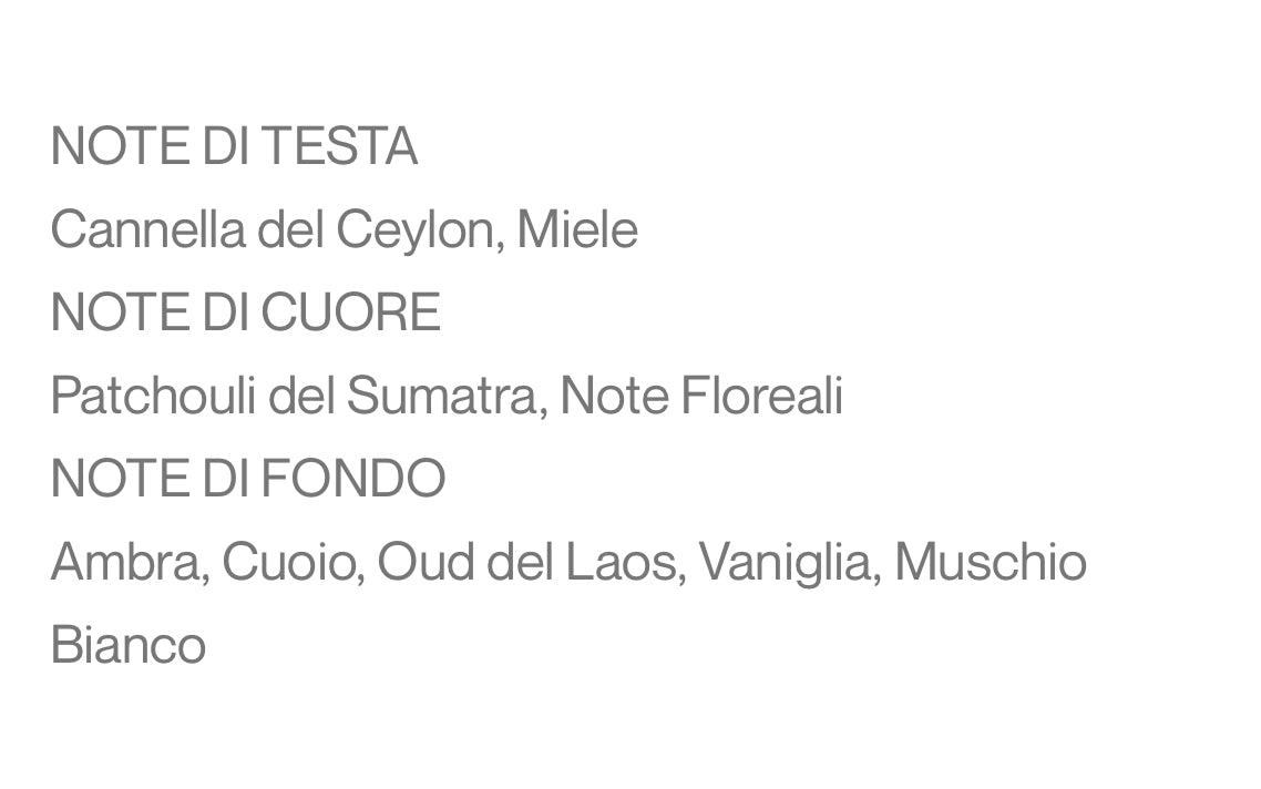 Il cuore pulsante di Miele e Oud è esaltato dalla Cannella del Ceylon. Il Patchouli si fonde con la Vaniglia plasmandosi in una nuvola di resistibile dolcezza.