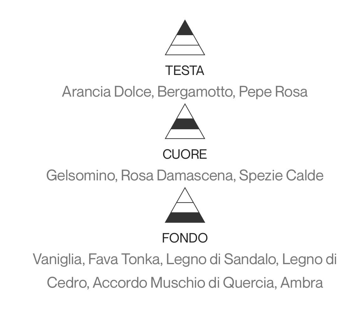 È una dose d’amore mistico e istantaneo nelle tue mani. La composizione, pura e seducente, si apre con note di testa all’Arancia dolce, al Bergamotto e al Pepe Rosa.