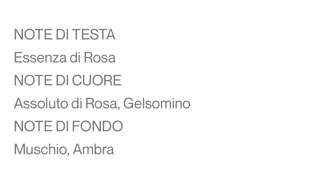 Una fragranza dove le Rose più pure e pregiate vengono armonizzate con maestria dal delicato Muschio Bianco, per poi avere un tocco seducente e sensuale con note di Ambra e Gelsomino.