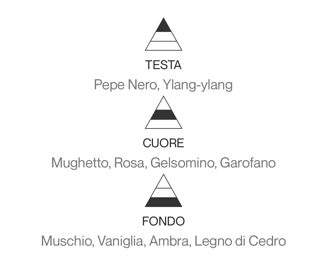 Le note di testa aprono con una combinazione inconfondibile di Ylang-ylang e Pepe Nero.