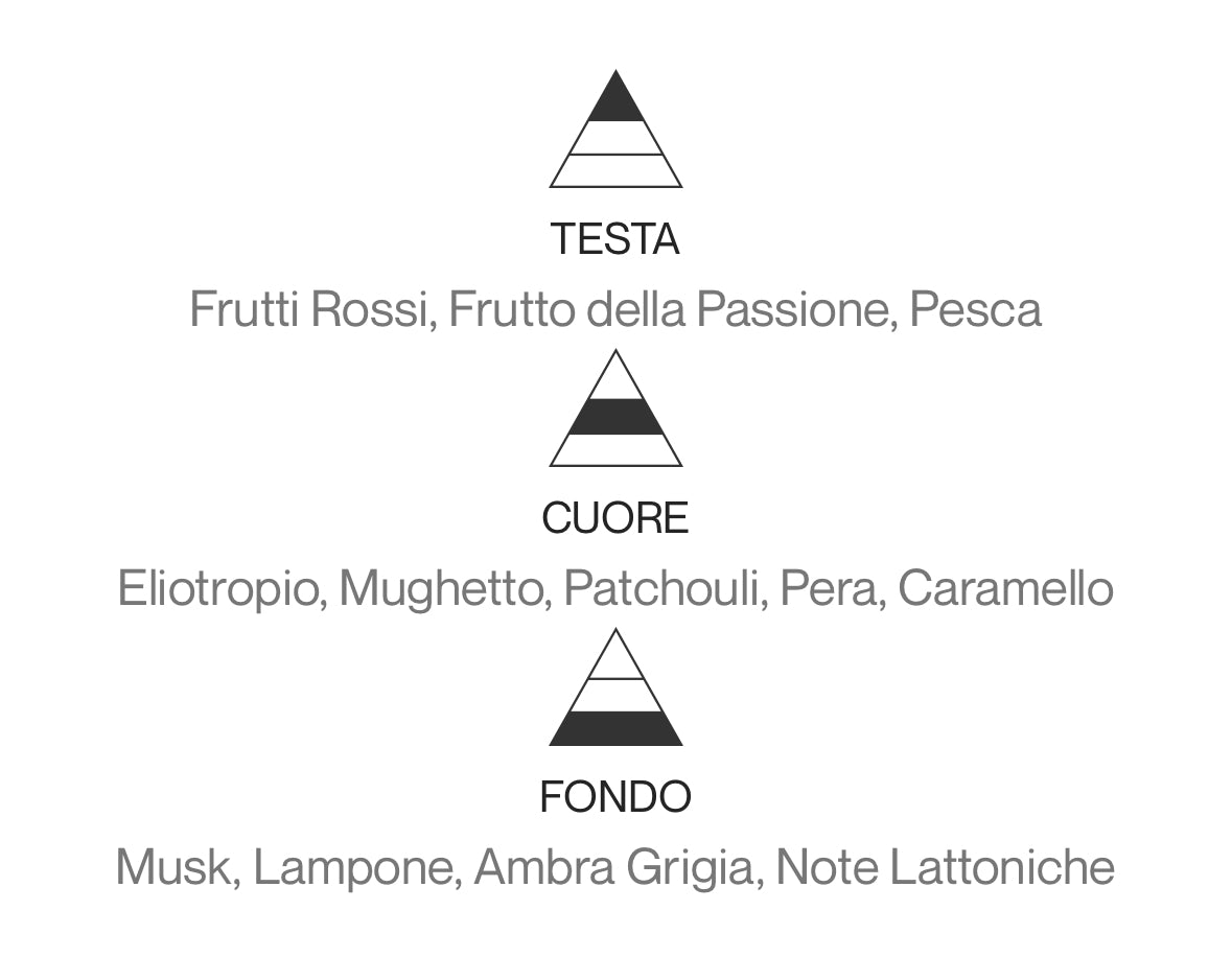 Il cuore suadente, unisce l’eliotropio al mughetto e il patchouli alla pera, legando il tutto a un dolce armonioso caramello.