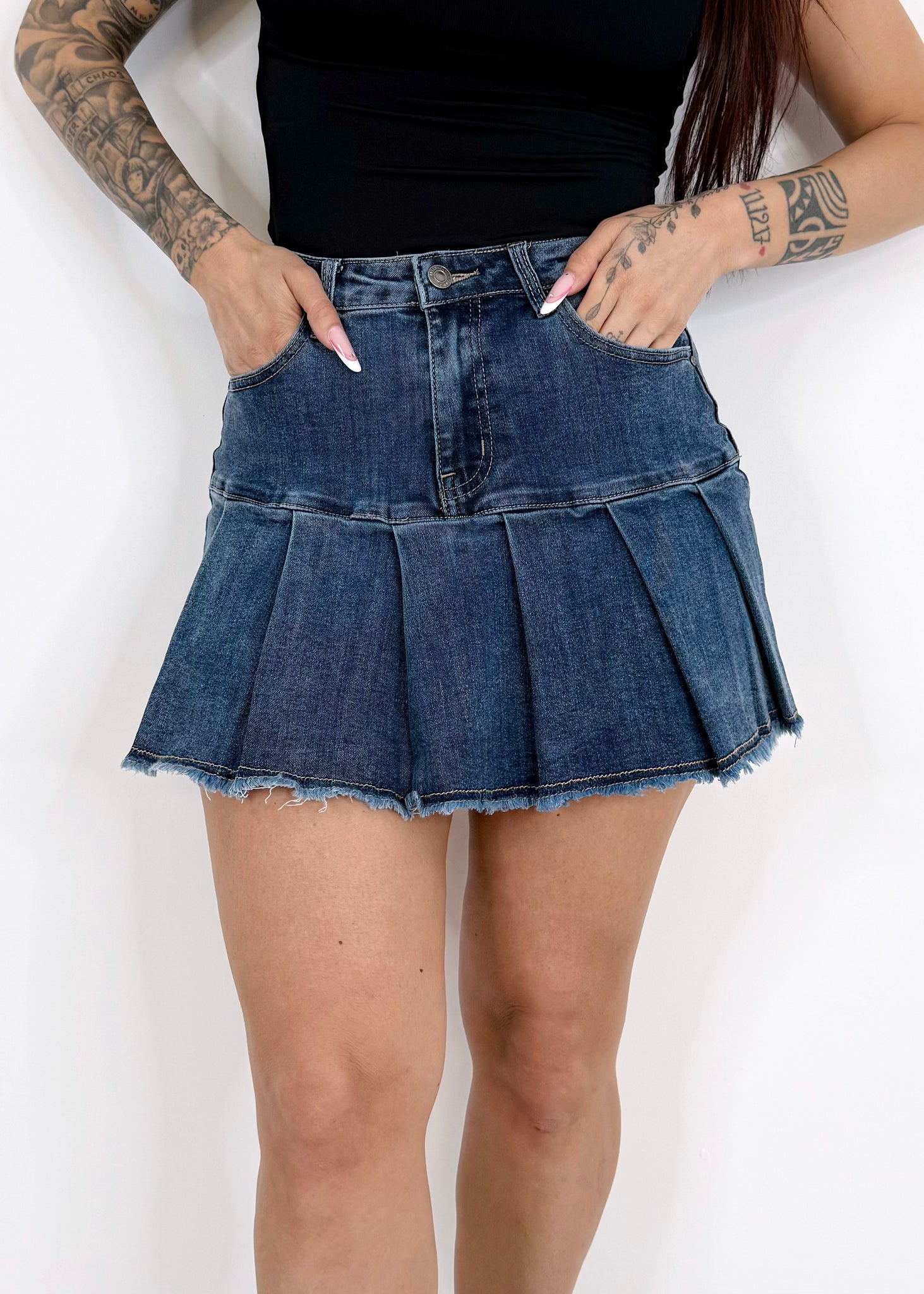Gonna a pieghe in denim elasticizzato, comoda e super femminile. Il taglio a pieghe dona movimento e uno stile fresco, mentre il tessuto stretch assicura una vestibilità perfetta. Perfetta da abbinare a sneakers o stivaletti per un look casual ma curato.