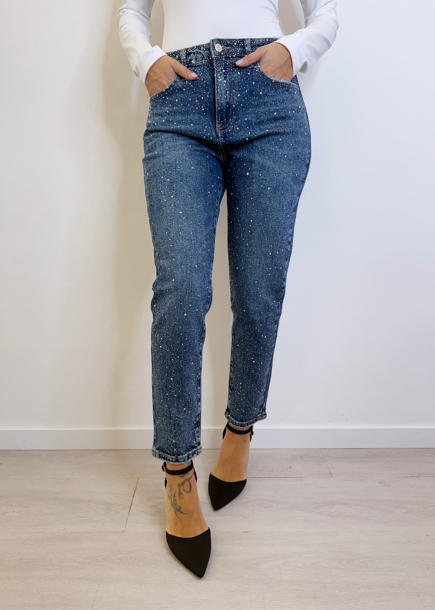 Jeans stile boyfriend in denim comodo con brillanti applicati sul davanti, concentrati sulla parte alta della vita per un tocco luminoso. Parte posteriore pulita. Vestibilità morbida e confortevole, pensata per valorizzare le curve.