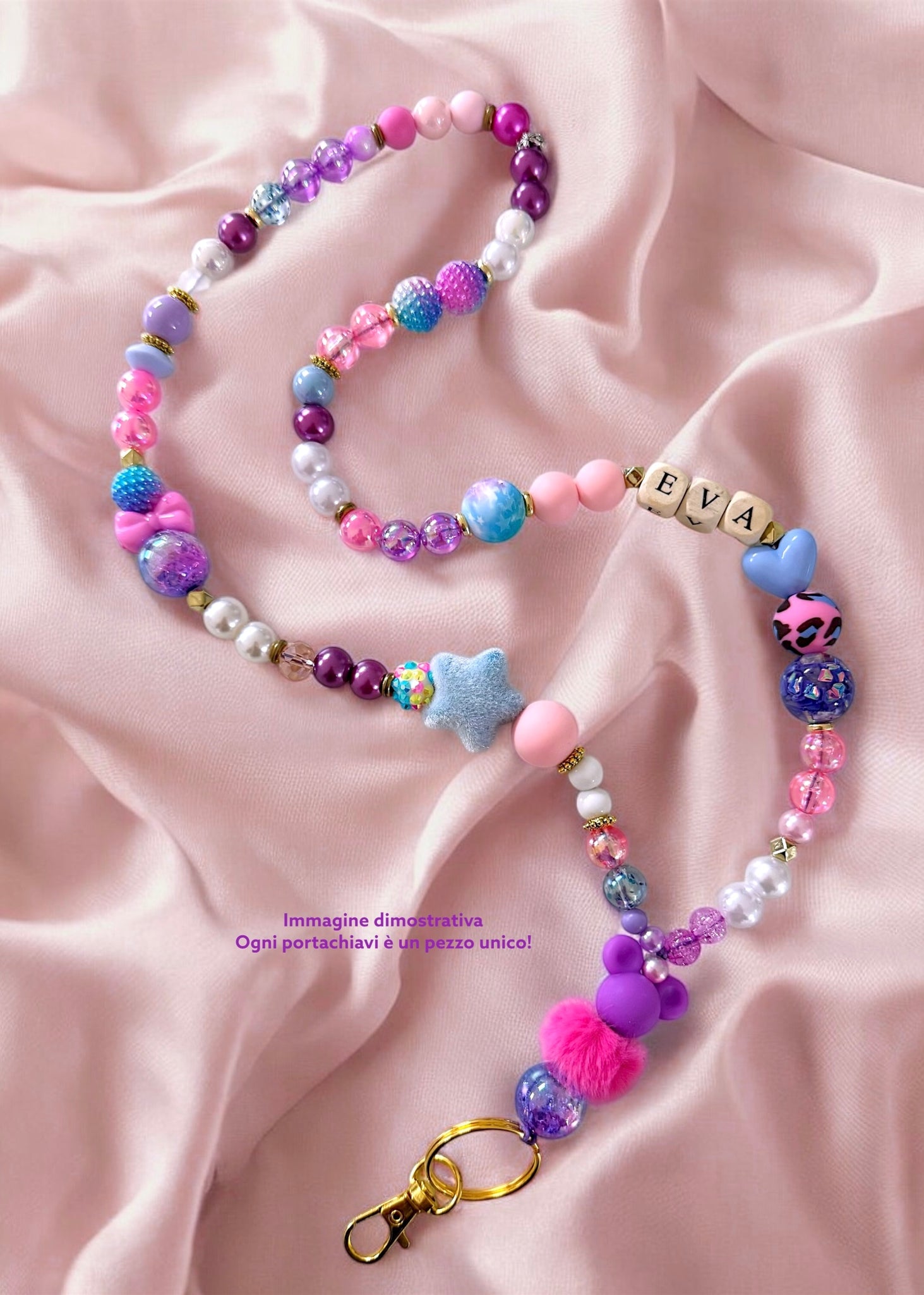 Ogni portachiavi è realizzato a mano direttamente dalle Dudine, con perle colorate e tanta cura. Nessun pezzo sarà mai identico a un altro: ogni creazione è unica!