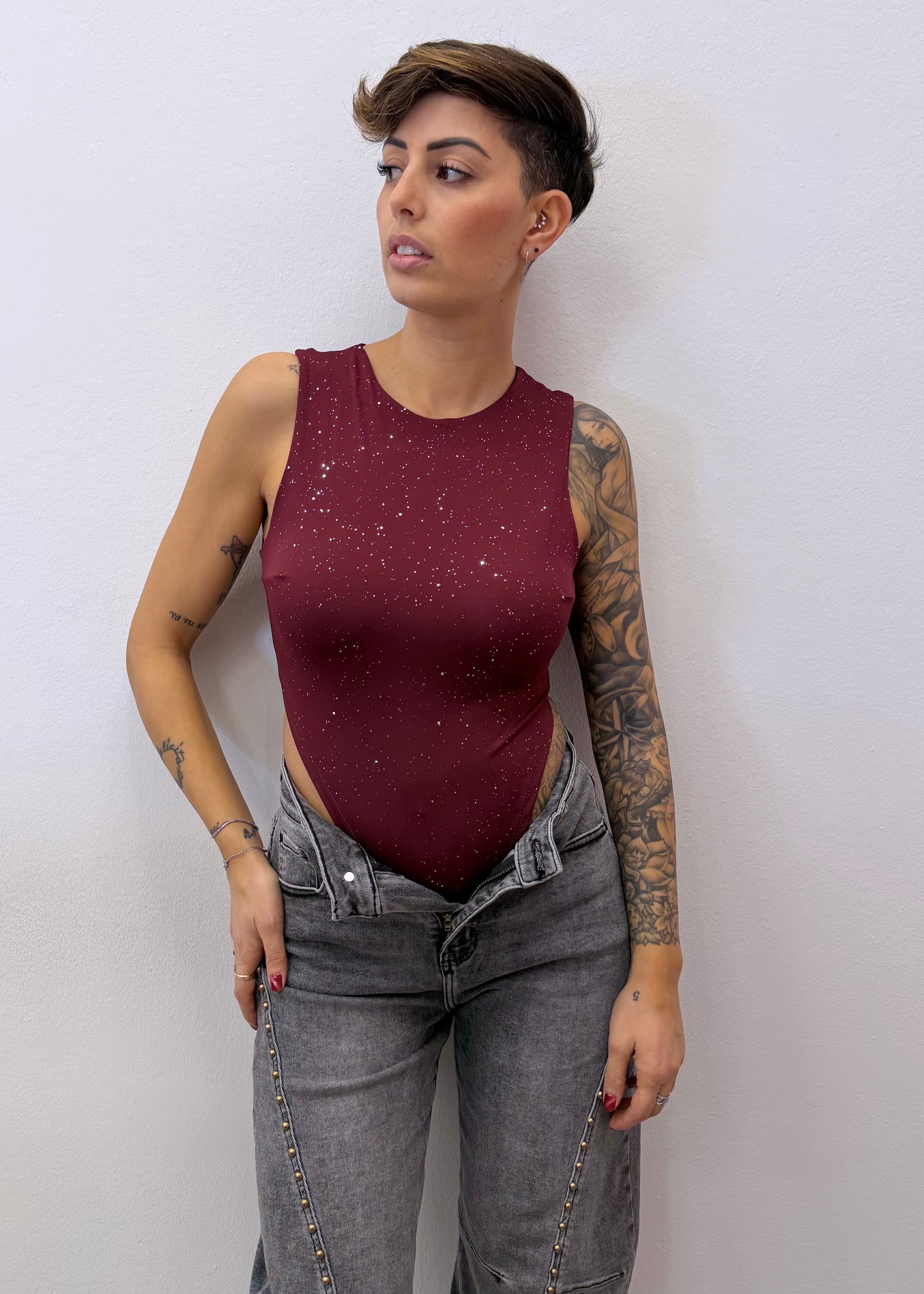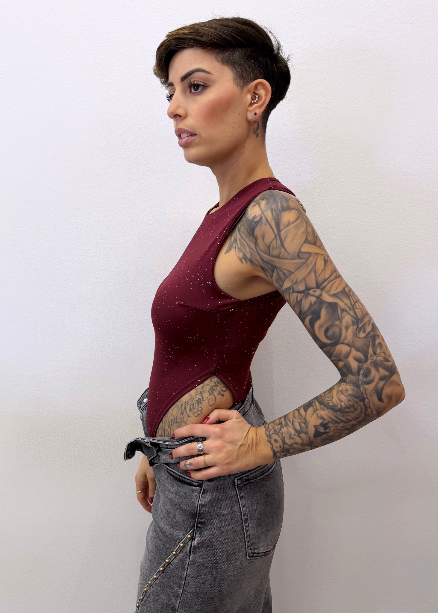 Body girocollo smanicato sciancrato, dal fascino luminoso. L’effetto sparkling lo rende perfetto per look da serata o per un outfit stile Capodanno.