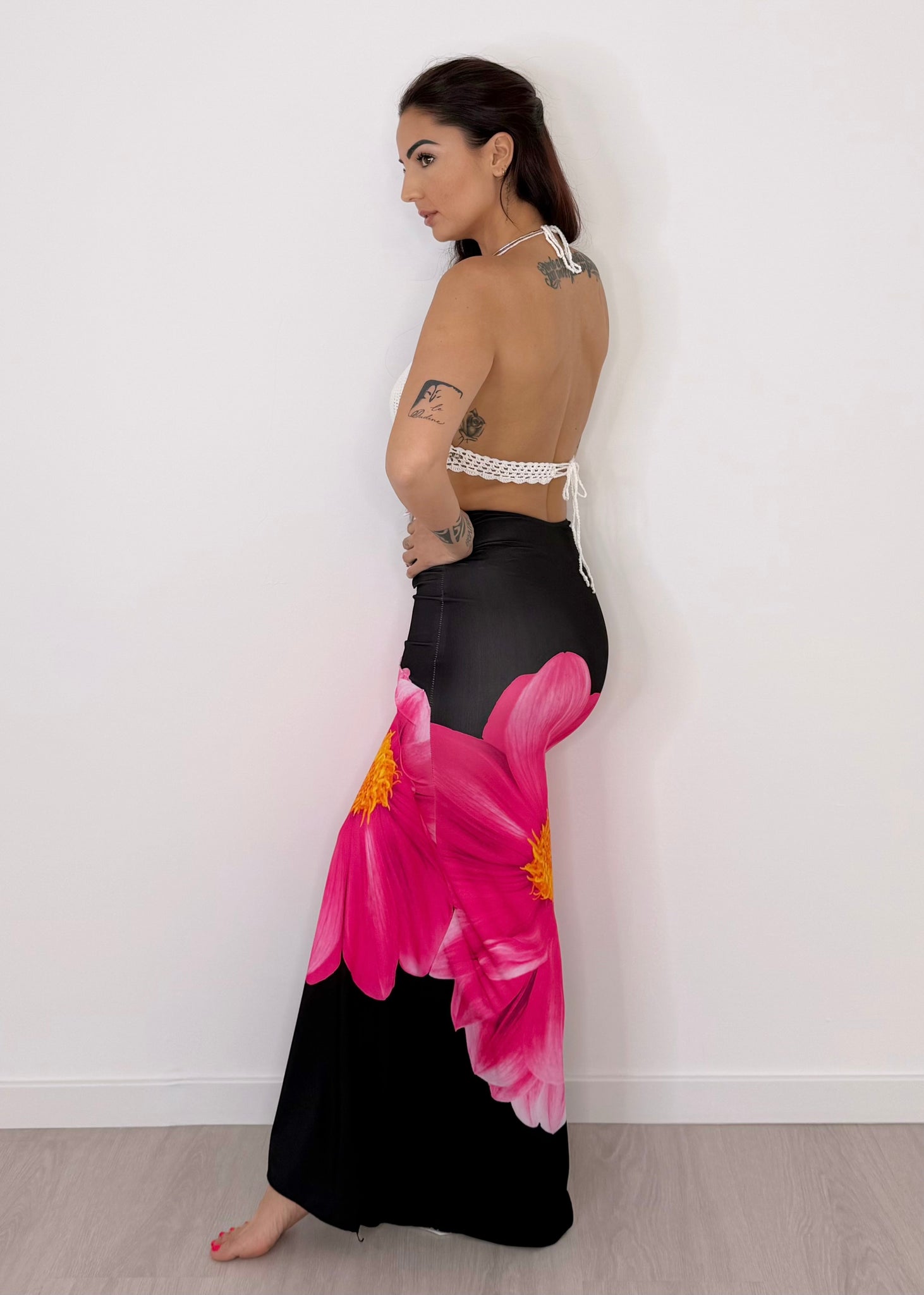 Abito estivo con top in Sangallo bianco arricchito da borchie e gonna nera con vivaci fiori fucsia. Un mix perfetto di romanticismo e grinta per un look fresco e originale.