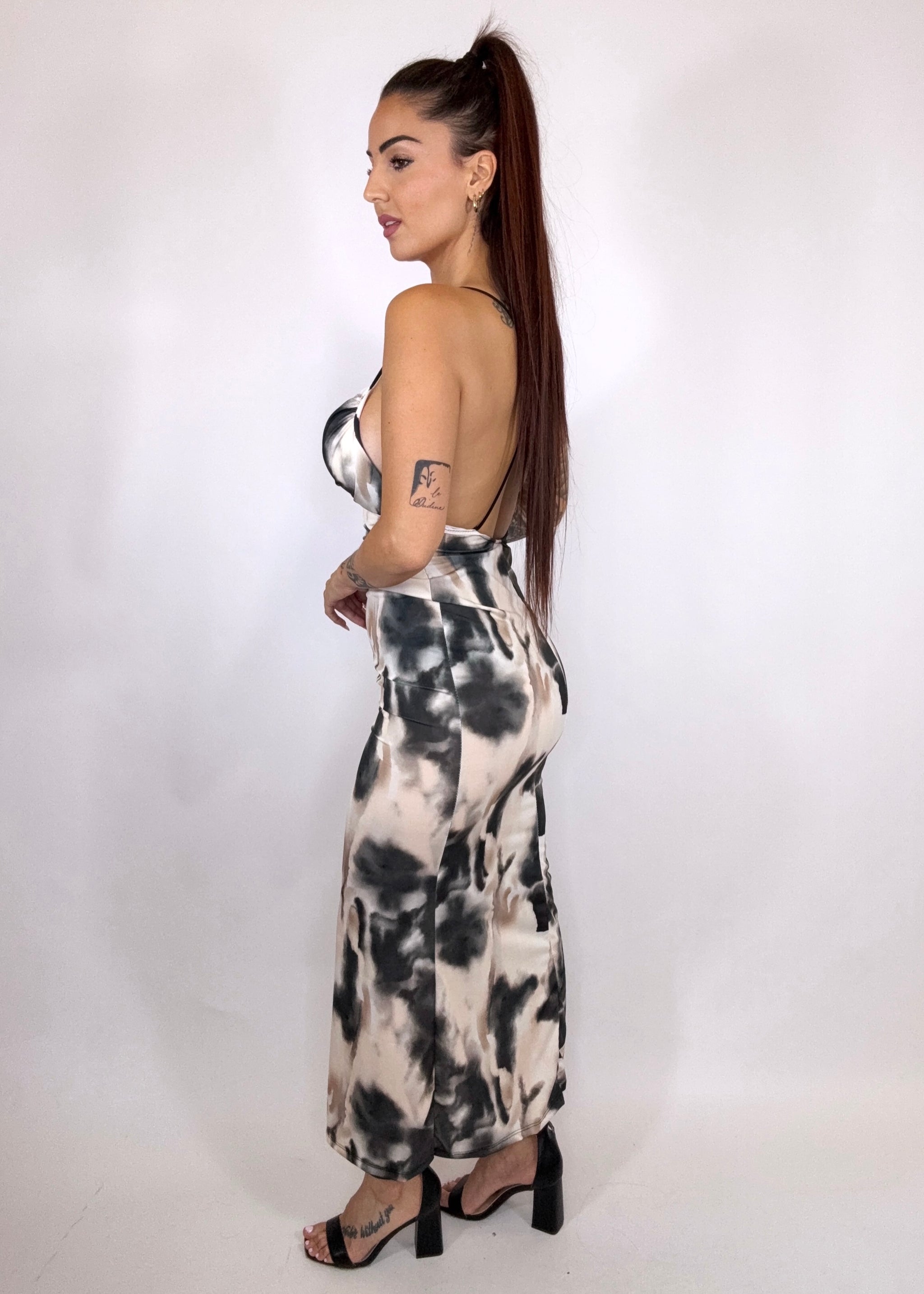 Questo abito lungo è un capolavoro di sensualità e raffinatezza. La coppa preformata con scollo a V e ferretto valorizza il décolleté con struttura e grazia, mentre la schiena nuda con incrocio regala un tocco scenografico e audace. Privo di spacchi, segue le linee del corpo con classe, lasciando spazio solo alla bellezza del dettaglio. Veste bene da una XS ad una M.