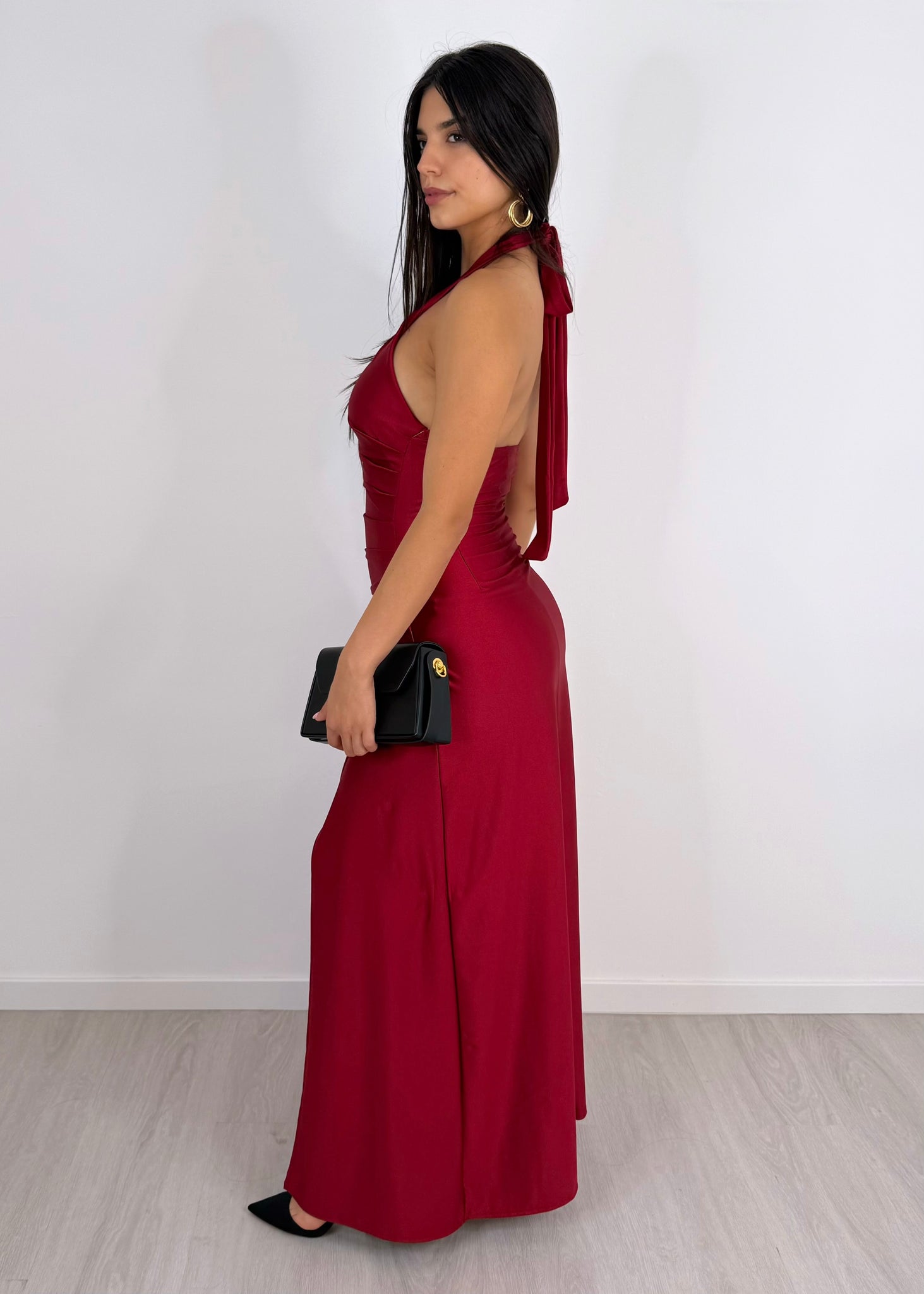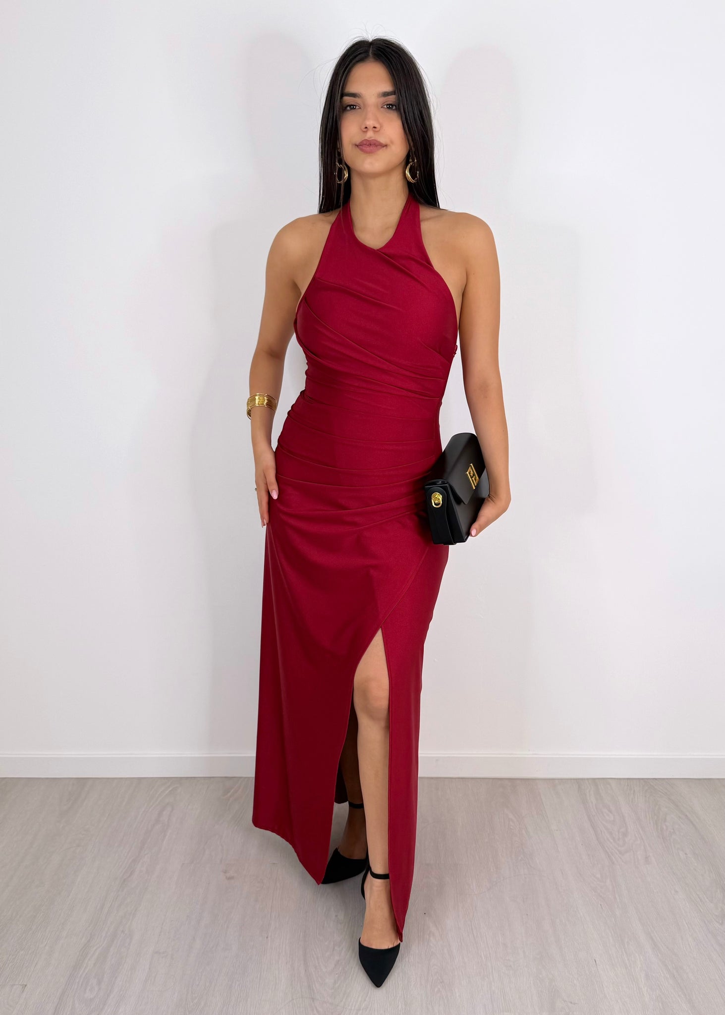 Raffinato e femminile, questo abito è perfetto per cerimonie ed eventi speciali. Il girocollo con laccio da annodare dietro lascia intravedere la parte alta della schiena, regalando un tocco sensuale ma sempre elegante. Il dettaglio drappeggiato sul fianco scolpisce delicatamente la silhouette, mentre lo spacco sulla gamba sinistra aggiunge movimento e leggerezza.
