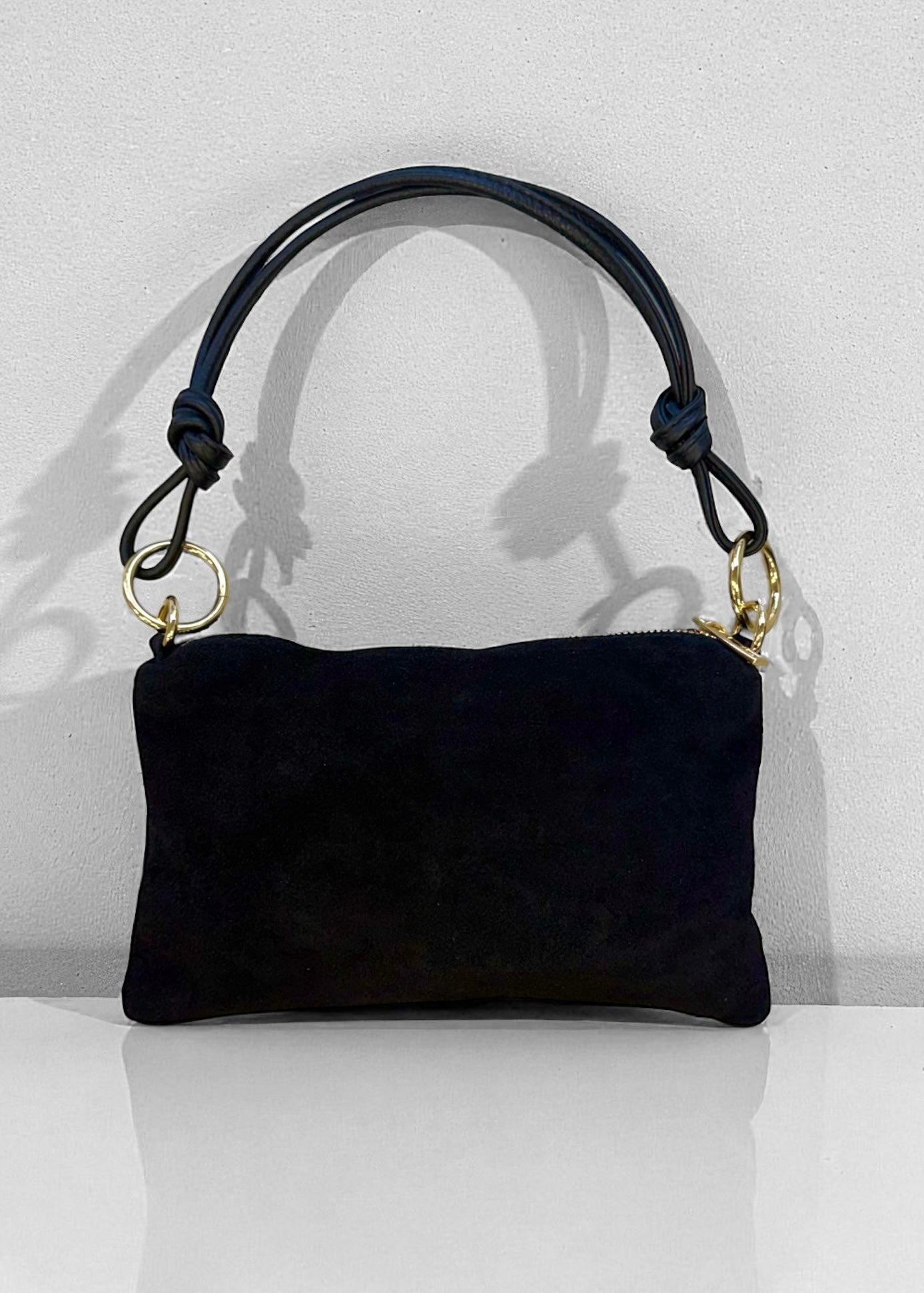 Il design è impreziosito da due anelli dorati frontali che aggiungono un tocco di luce e carattere. Il manico con nodo le conferisce un dettaglio unico e ricercato, perfetto per chi ama gli accessori originali ma discreti.