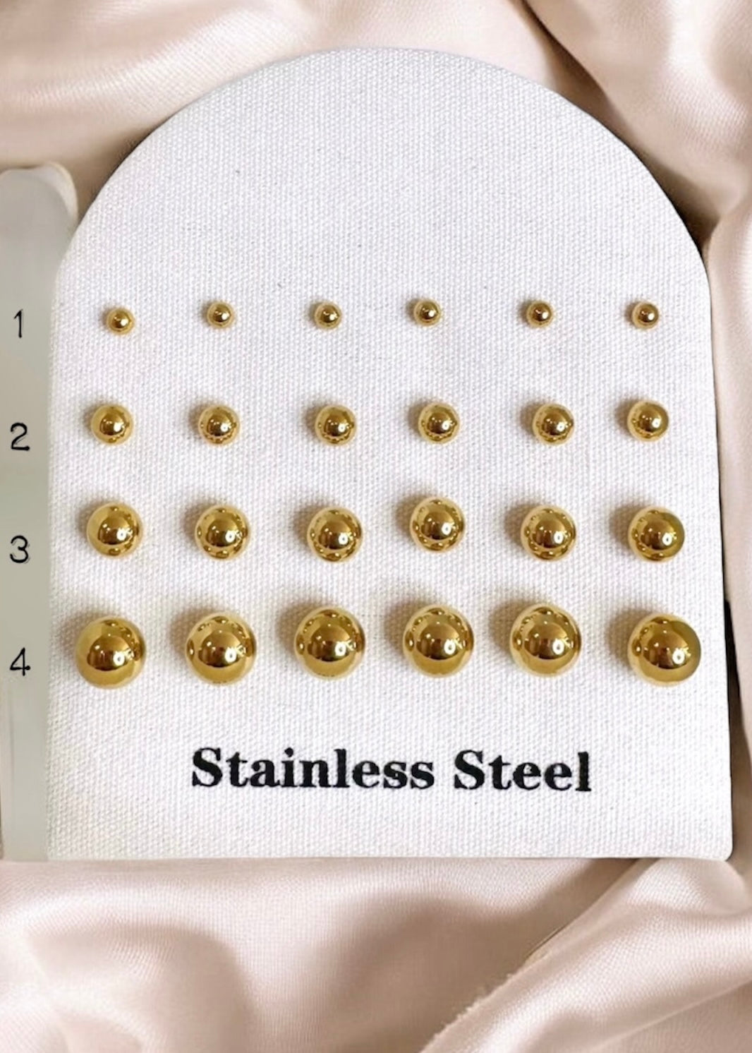 Coppia di orecchini in acciaio chirurgico anallergico, quindi nichel free a norma di legge. Quattro grandezze disponibili, la prima in alto è la più piccola quindi la numero 1, mentre l’ultima in basso è la più grande ossia la numero 4.