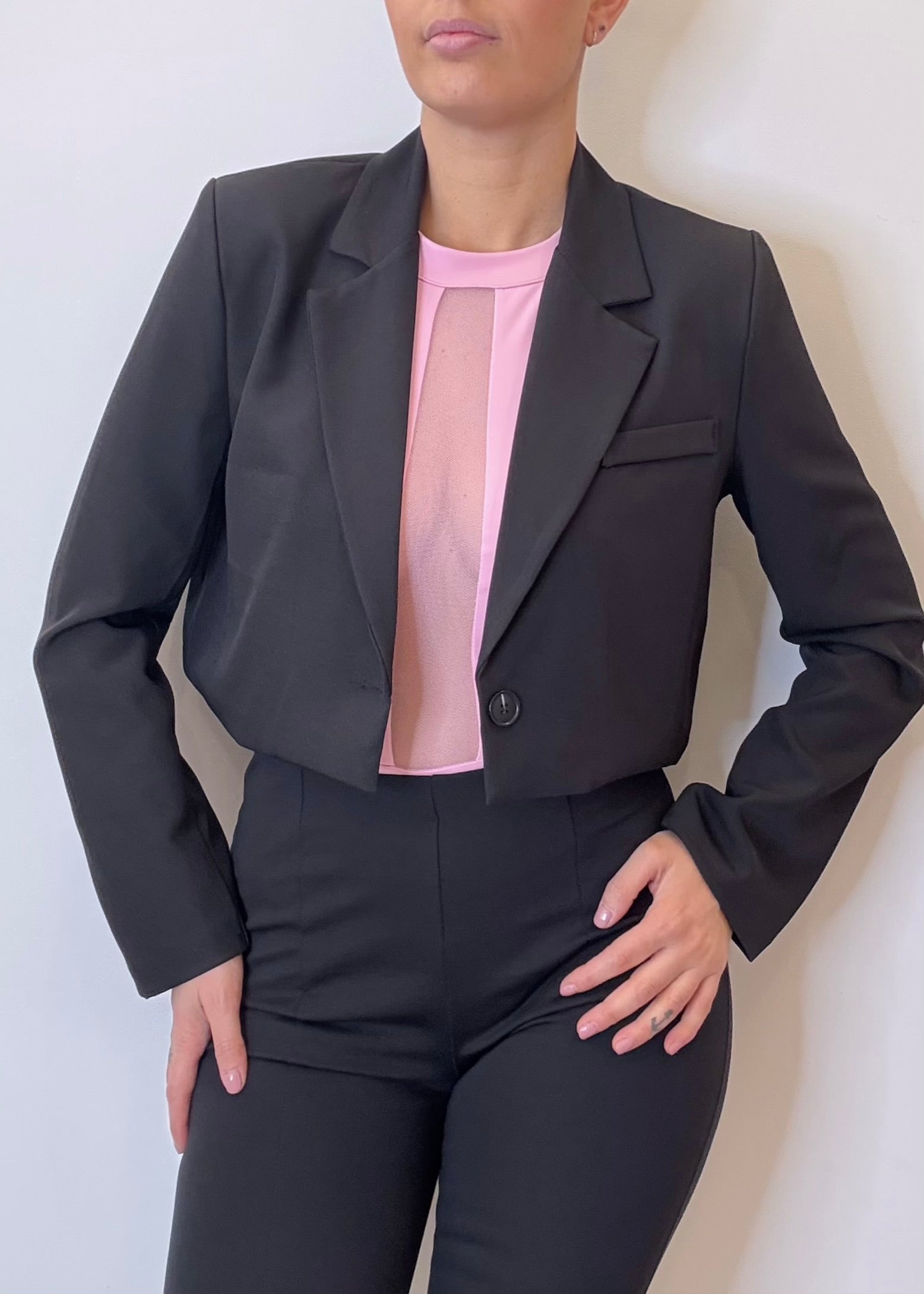 Giacca corta con spalline imbottite, variante elegante perfetta da abbinare con degli outfit eleganti.
