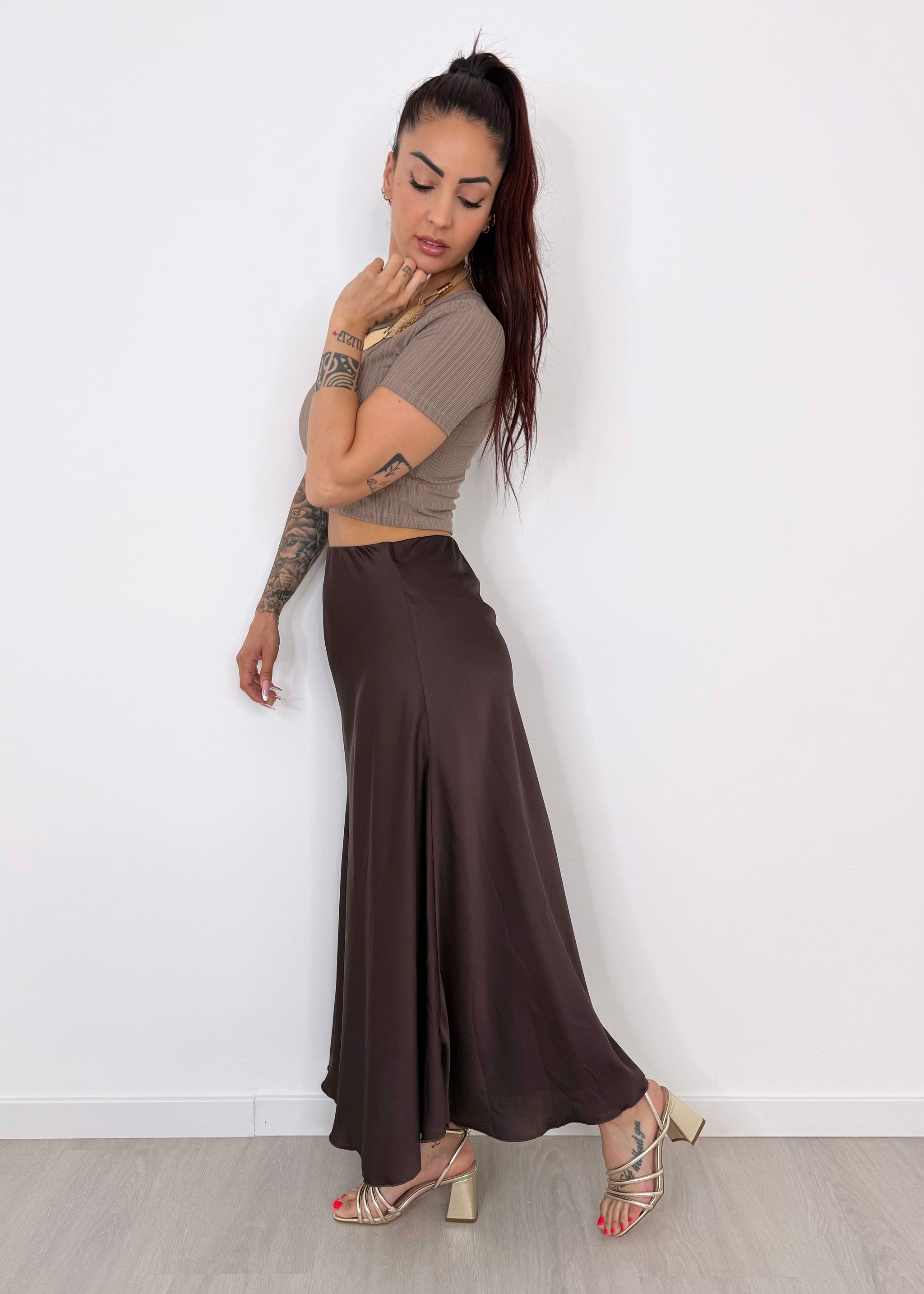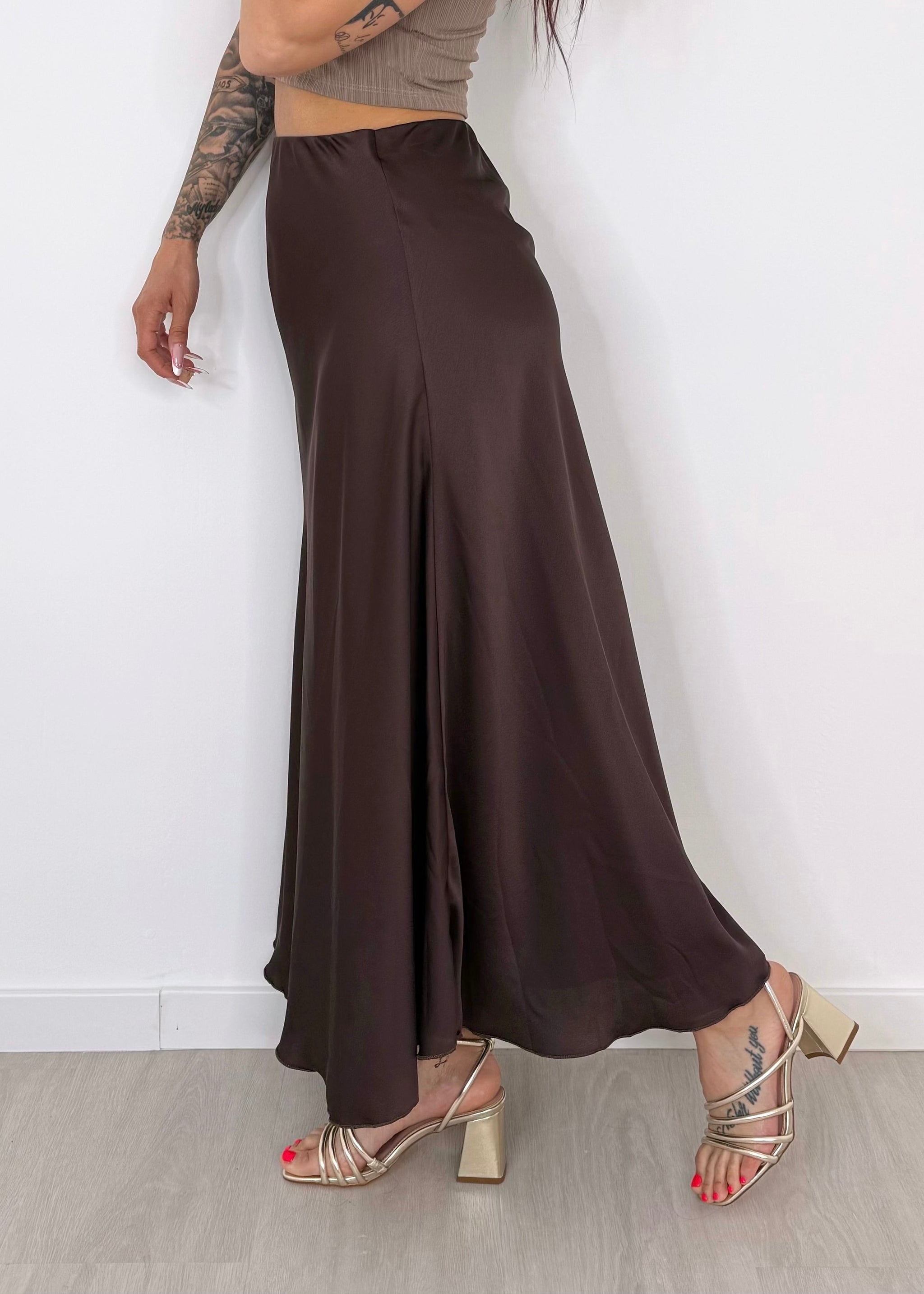 Gonna lunga in tessuto effetto raso, semplice e raffinata, con elastico sottile in vita che garantisce comfort e una vestibilità versatile. Il taglio scivolato valorizza la figura con eleganza, adattandosi perfettamente da una taglia XS fino a una M abbondante.