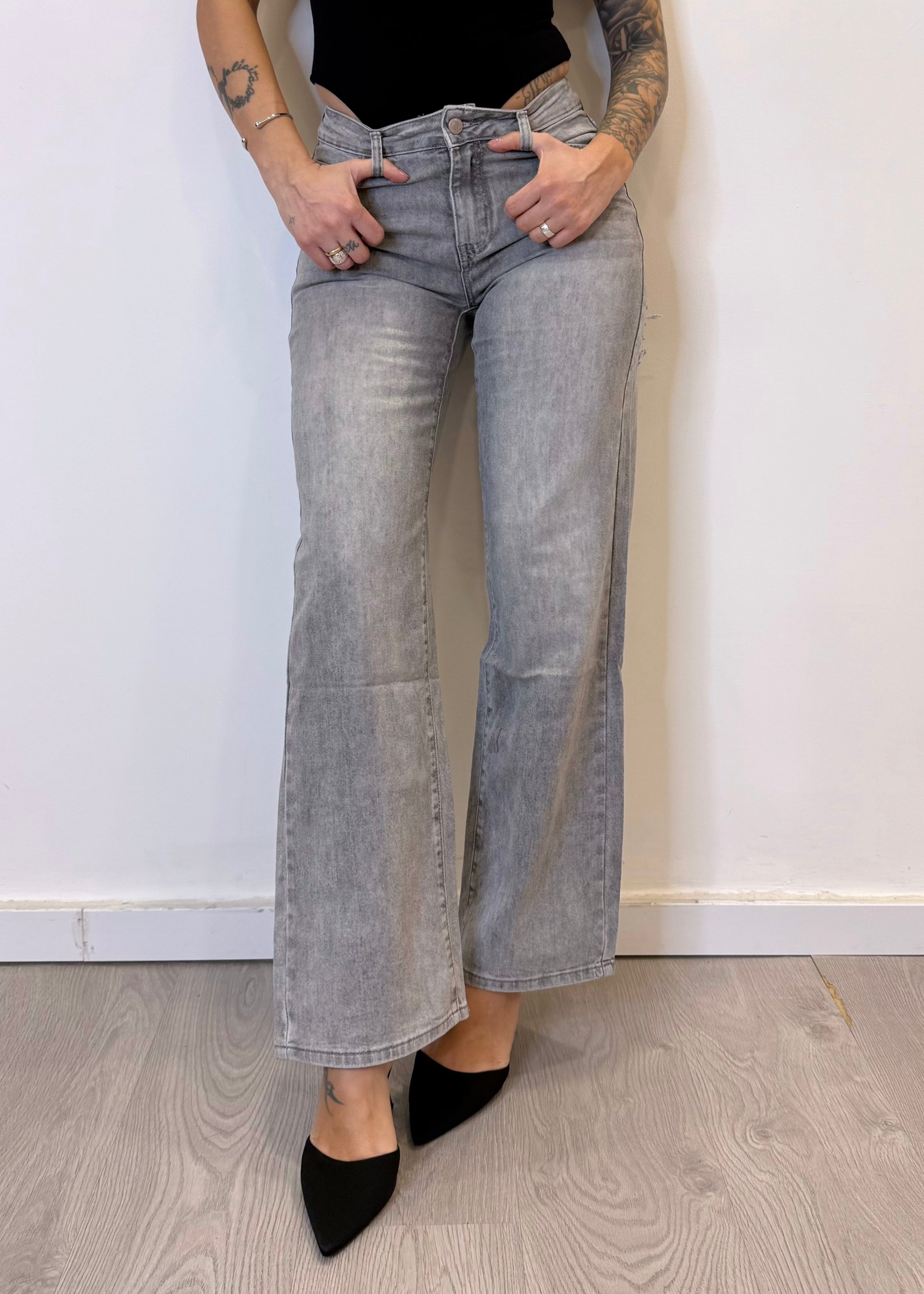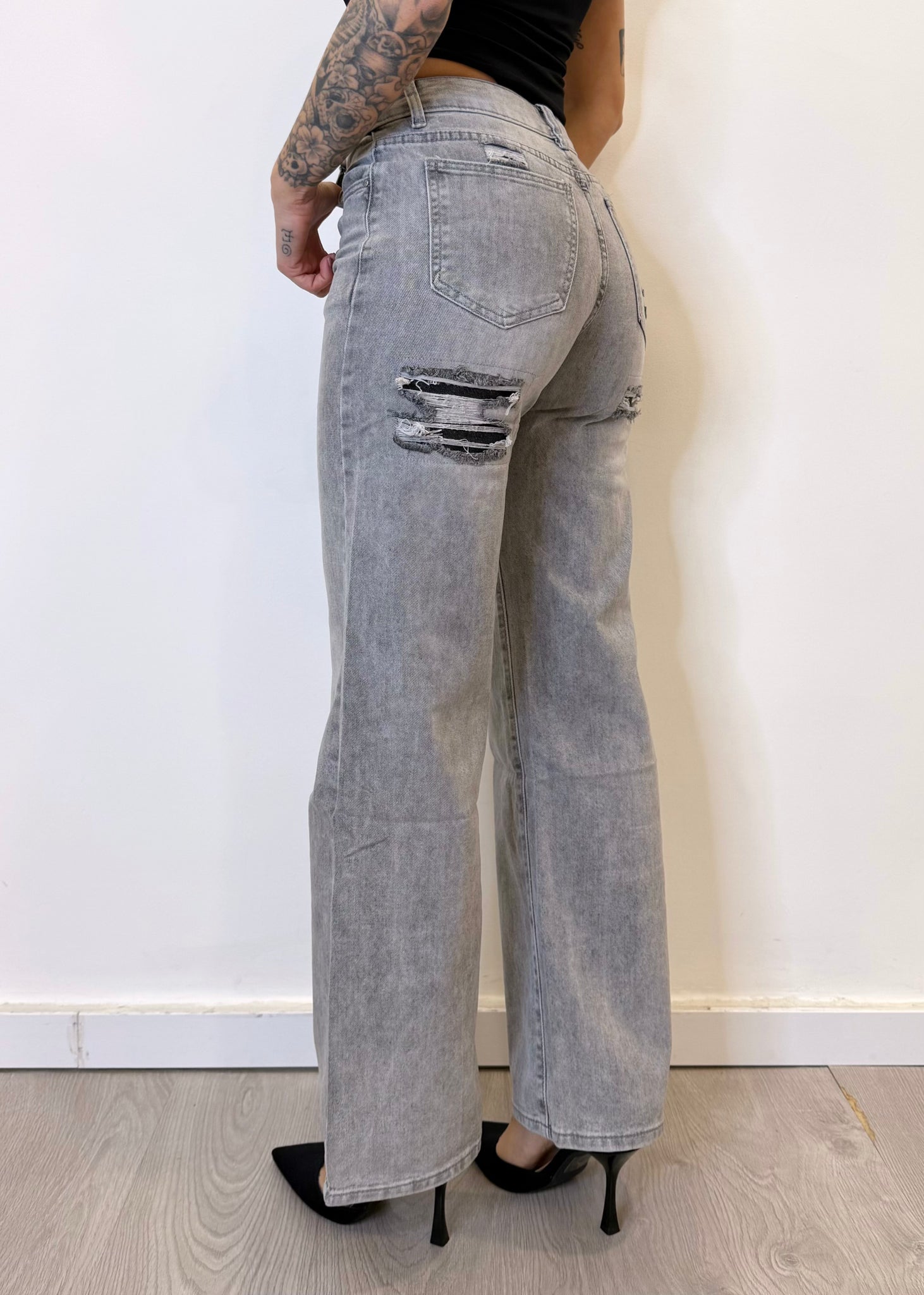 Jeans a palazzo grigio con strappi sul retro