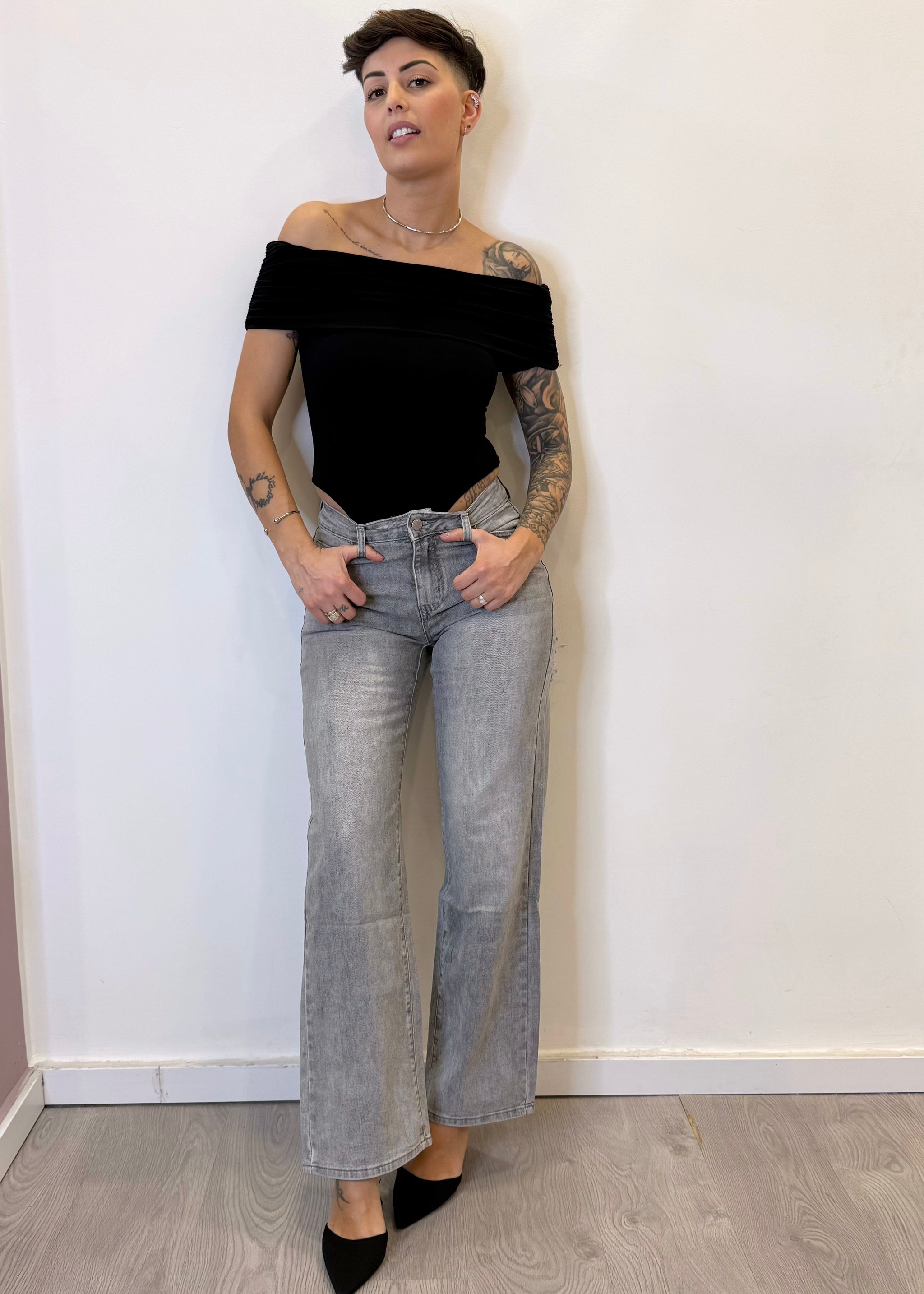 Grintosi e di tendenza, questi jeans a palazzo grigi uniscono comfort e stile. Il design ampio slancia la figura, mentre gli strappi sul retro aggiungono un tocco audace. Perfetti per look casual o più glamour, a seconda degli abbinamenti. Leggermente elasticizzati.