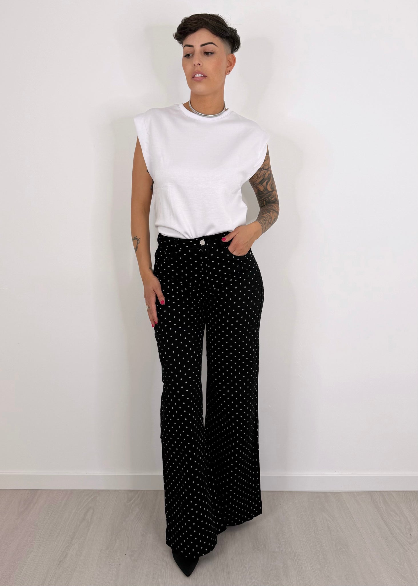 Jeans Pois, a palazzo nero a vita alta, in tessuto elasticizzato che valorizza la figura senza rinunciare al comfort. Linea pulita ed elegante, perfetto da abbinare sia con sneakers che con tacchi per un look versatile e sofisticato.