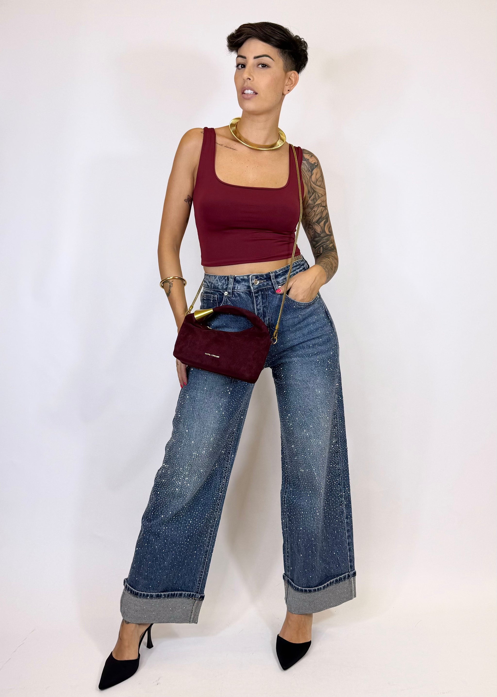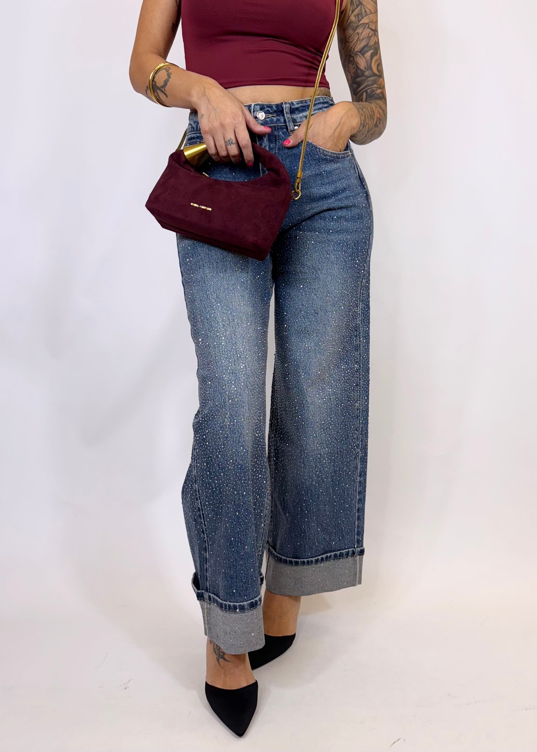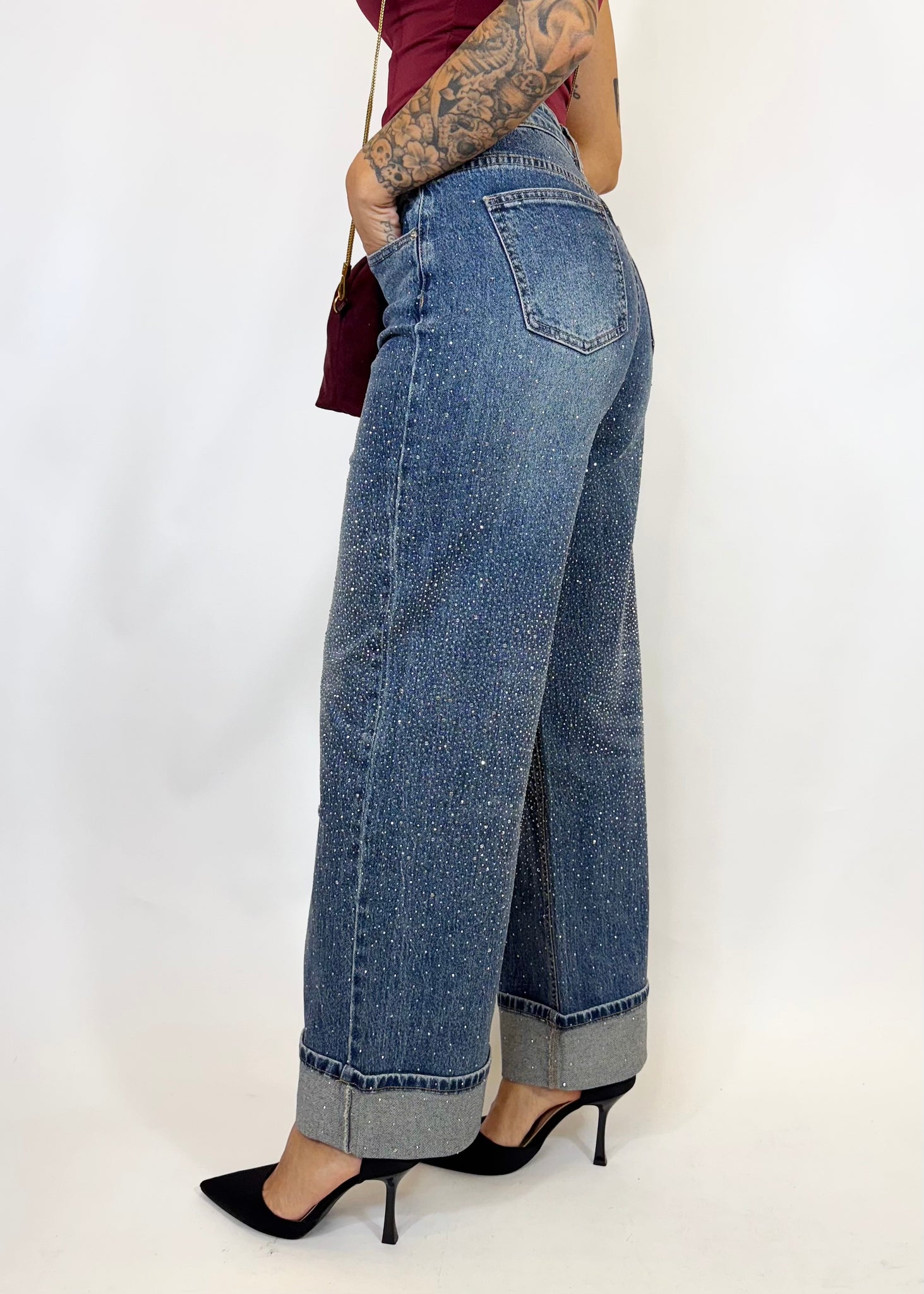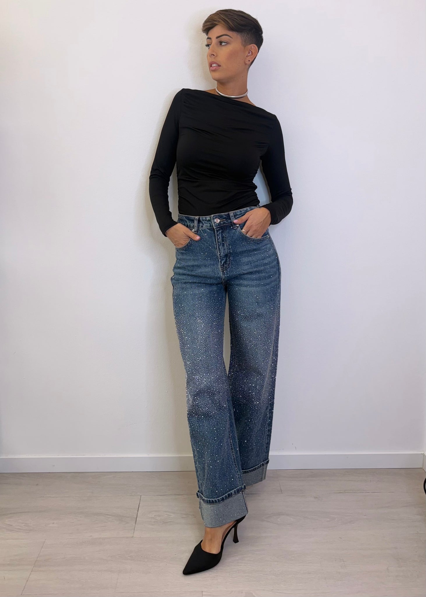 Questi jeans a palazzo non passano inosservati: larghi, fluidi e completamente ricoperti da una pioggia di brillantini che cattura ogni riflesso. Il risvolto finale aggiunge un tocco cool e curato, mentre la vestibilità morbida slancia la figura con stile.