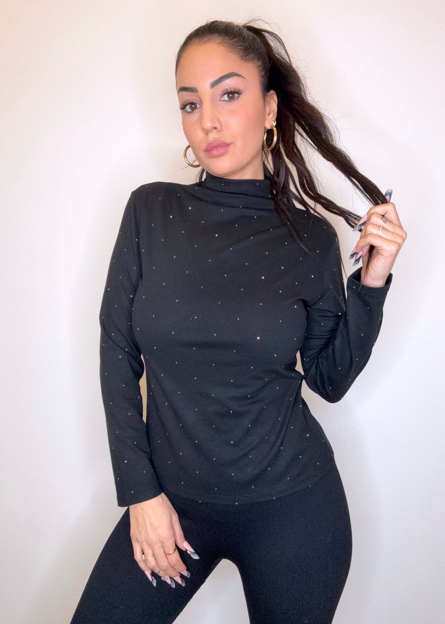 Maglia con brillanti dal tocco incredibilmente morbido e avvolgente, realizzata in viscosa. Elasticizzata e confortevole, è una taglia unica che veste perfettamente dalla XS alla L, adattandosi alla figura con eleganza. Ideale per chi cerca comfort senza rinunciare allo stile.