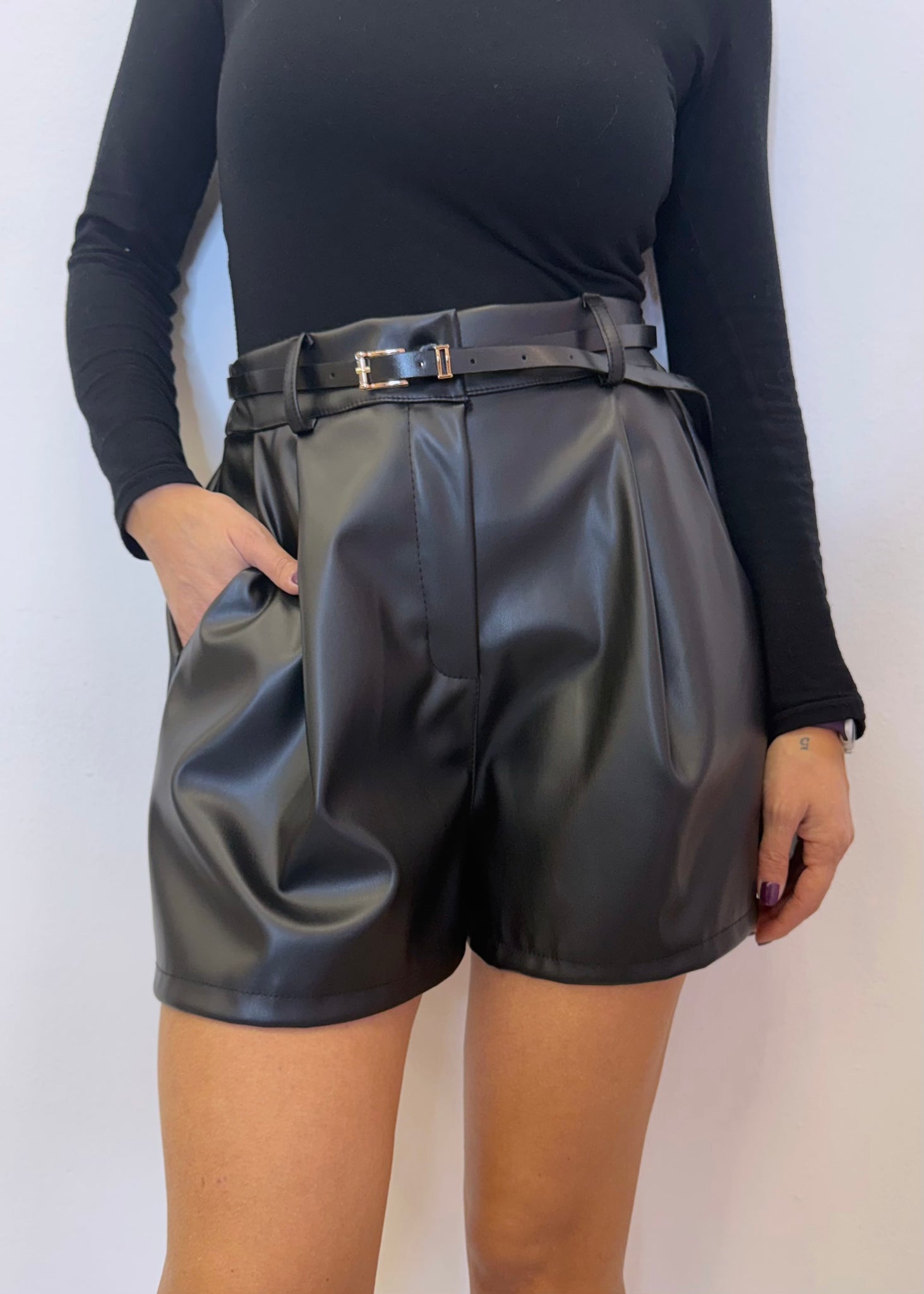 Shorts di eco-pelle nero over a palloncino con cintura, vita alta, elasticizzato nella parte posteriore.